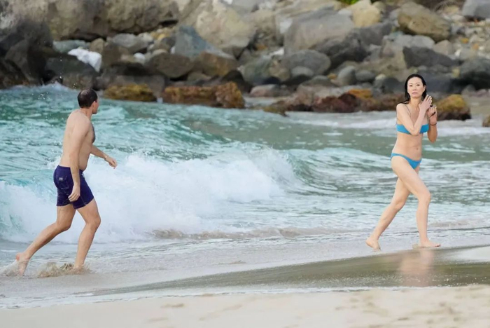 2021年,同一片海滩,邓姐和新欢鸳鸯戏水,你跑我追。