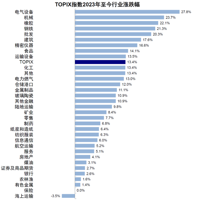 传统行业领涨。2023年初至今,日本宽基指数TOPIX上涨13.4%,而电气设备(27.8%)、机械(23.7%)、橡胶(22.1%)、钢铁(21.3%)等跑赢指数,但零售(7.7%)、信息通信(6.0%)、服务(5.1%)等跑输指数。