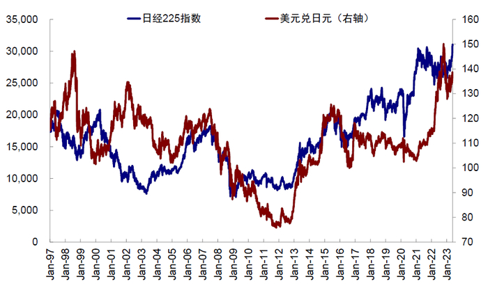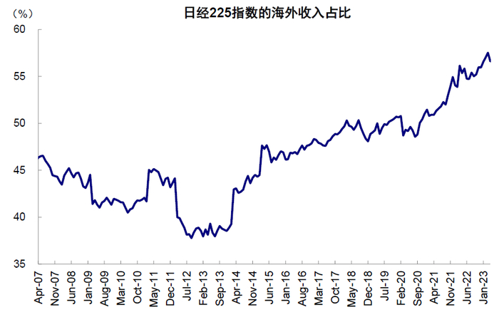 日元贬值。日本指数上涨中,日元贬值贡献了近乎半数。年初至今(2023年5月27日),以日元计价,日经225指数上涨18%。但同期日元贬值6.8%(美元兑日元从131.1至140.6)。实际上,以美元计价的日经225指数涨幅只有10%,美元计价的日本市场也并未创出新高,甚至还未从2022年的回撤中完全修复。除了对名义指数直接的影响外,日本企业依赖海外收入(日经225指数的海外收入占比近期已经提升至50%~60%),汇率贬值对企业通常也有利好。