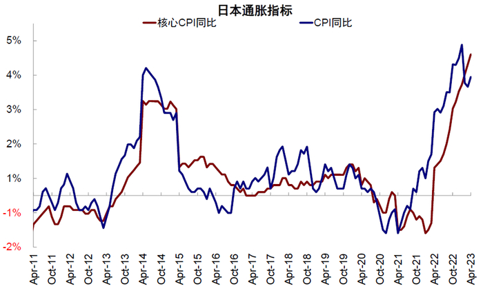 ► 首先,货币政策仍旧面对调整可能。伴随美联储加息接近尾声,美日利差对日本汇率压力最大的阶段可能已经过去。日央行调整YCC上限,甚至放弃YCC政策的紧迫性下降。但YCC对日本国债市场带来的扭曲危害依然较大,鸽派政策也导致日元陷入第二轮贬值阶段。从通胀数据看,输入性通胀已经回落,核心通胀(日央行希望看到的通胀)仍在上升,且4月高达4.1%,消费景气带动日本逐渐走出通缩陷阱。在经济修复上行过程中调整YCC政策,相比去年汇率货币政策互搏的情况,造成的影响或更加温和。