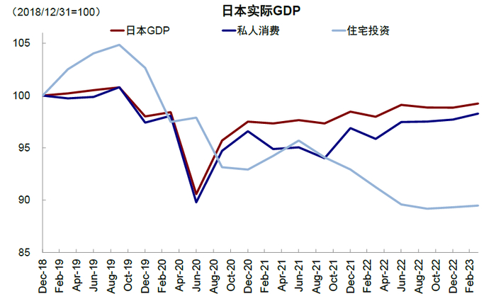 图表:日本实际GDP中私人消费规模已经超过2019年底水平,但住宅投资仍有12.8%的差距
