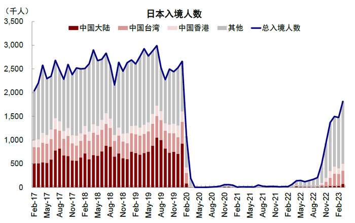 图表:截至2023年3月,日本入境游客人数已经修复到2019年同期的65.8%