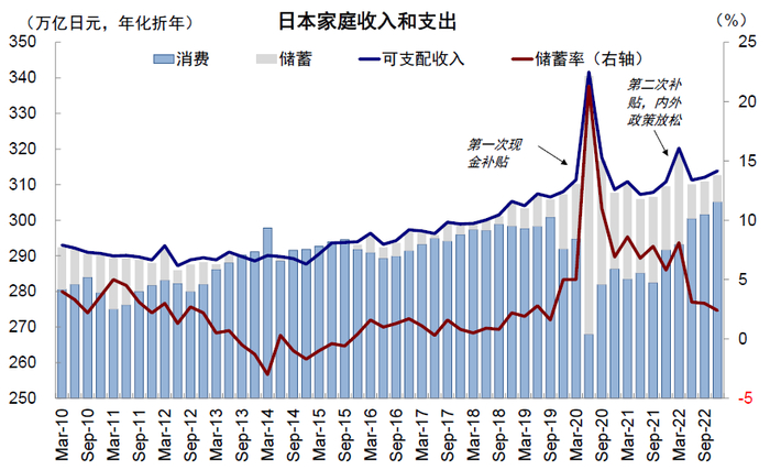 图表:居民收入并未受损,消费信心的提振也导致日本储蓄率已经降至疫情前水平