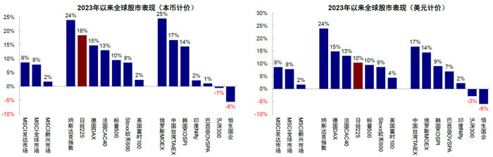 3)AI等产业趋势推动。Open AI的CEO Sam Altman在4月10日会见了日本首相和其他高级官员[5],日本也是其在ChatGPT亮相以来的首次海外目的地。台积电在日本熊本建设半导体工厂(日本经济产业省为台积电、索尼和Denso提供约35亿美元额补贴)[6]。媒体称[7][8],韩国三星、SK海力士等半导体企业也可能加强与日本的合作。此外,如果关注2023年全球涨幅较高的市场,除日本外,美股纳斯达克、中国台湾和韩国都名列前茅,而这些市场都受益于AI产业。