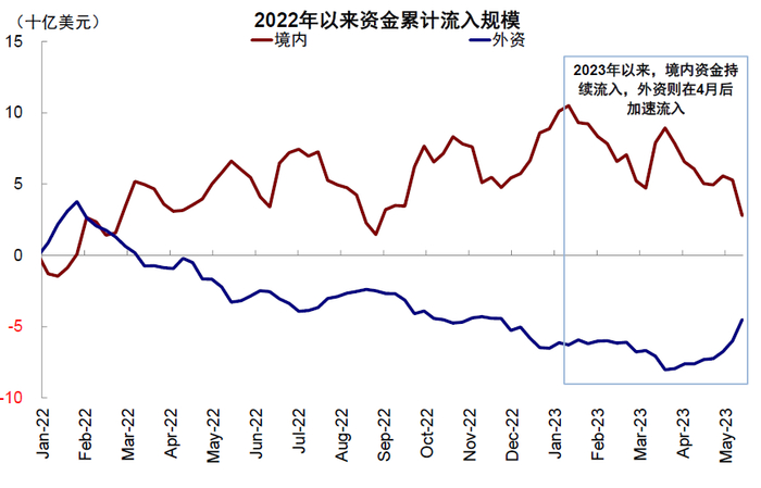 图表:2023年以来,外资累计流入日本19.7亿美元,但境内资金则流出58.0亿美元