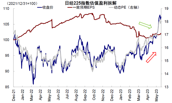 估值贡献为主。2023年3月开始,偏鸽的货币政策预期使得日本10年期国债结束对0.5%上限的冲击,回落至0.3%~0.4%左右水平。日经225指数动态PE从去年14倍升至2023年5月的18倍,而市场盈利一致预期仅止跌企稳,并未上行(18.5%的指数涨幅中,估值扩张22.7%,EPS反而收缩3.1%)。