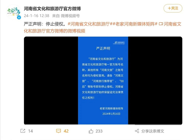 1月16日,河南省文化和旅游厅在官方微博、抖音账号发布严正声明称,“河南省文化和旅游厅”为河南省文化和旅游厅唯一官方账号名称,其他所有“河南文旅”之账号名称均为侵权冒用。请各“河南文旅”、“00河南旅行推荐官后”等账号即刻停止侵权。河南省文化和旅游厅始终保留追究法律责任之权利!
