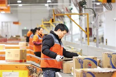 重庆市巴南区公路物流基地的一家物流企业内,工作人员正利用自动分拣系统分拣快递包裹,以应对不断攀升的电商物流需求。李 攀摄(人民视觉)