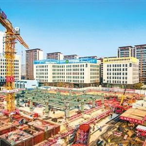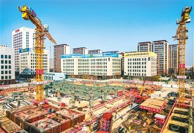 江苏省宿迁市电子商务产业园区电商大厦工程项目是市级重大产业项目,建成后将有助于推动当地电商产业发展。图为电商大厦工程施工现场,塔吊林立,工人正在加紧施工。王帅甫摄(人民视觉)