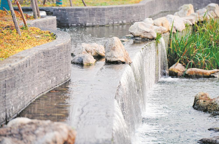 同时,公园采用下流式预埋微生物垂直潜流人工湿地方案,利用人工介质、植物、微生物的物理、化学和生物三重协同作用净化水质。公园水池内则铺上砂石,种植各类水生植物有效净化水质,湿地的植物从水中吸收营养,成熟后再进行收割,实现资源的循环利用。