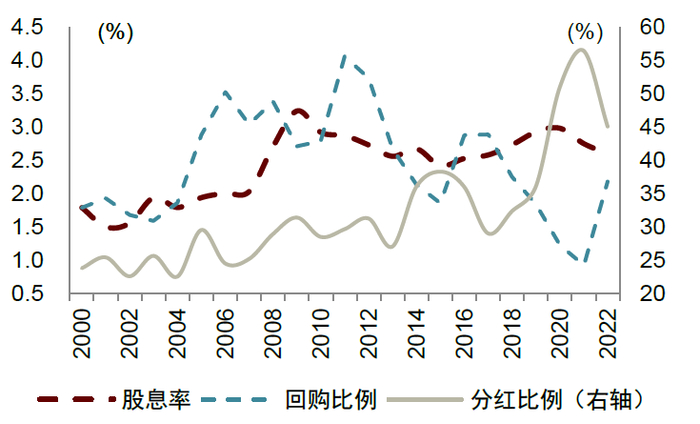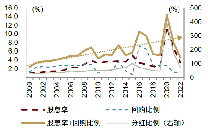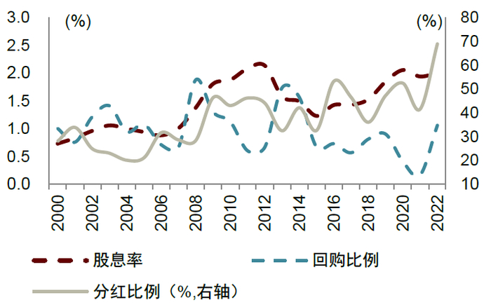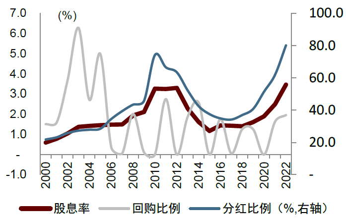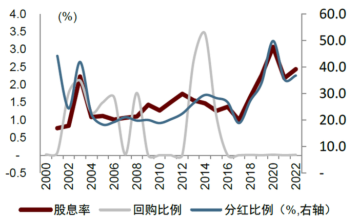 盈利增速放缓背景下,提高分红和回购比例或可带动估值提升。我们认为,从股票预期收益率公式来看,当公司盈利增长放缓时,提高分红比例和回购比例可带动股票收益率的提升;而当股票收益率高于投资者对股票的要求回报率,投资者对该股票配置的吸引力则会增强,相应会使得股息率压低至合适水平,对应估值提升。我们保守假设某上市公司未来长期收入和利润增速较低(假设为2.4%),股东要求回报率为8.0%,当公司分红比例为60%,则PE估值底部为11x(60%除以(8.0%-2.4%));假设该公司提高分红比例至80%,则PE估值底部为14.3x。(若假设股东要求回报率6%,则相应估值低会更高,两者假设下分别为16.7/22.2x PE)