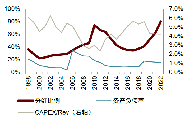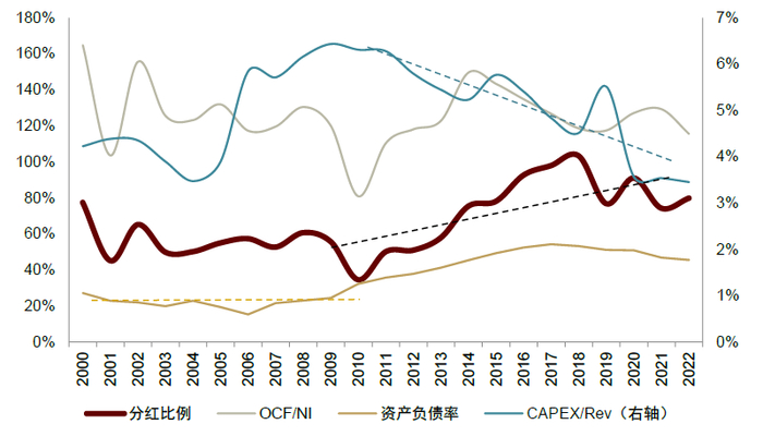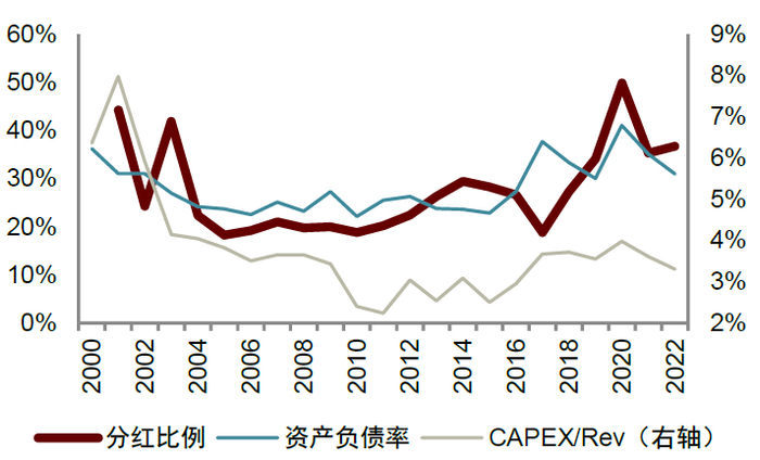 ►从负债率上看,分红比例提升初期,资产负债率低于20%并处在下降阶段。花王在2000-2022年的资产负债率均值约14%,负债率均值从2000-2010年的16%下降至2011-2022年的12%。公司负债率整体维持在较低水平,为高分红提供保障。