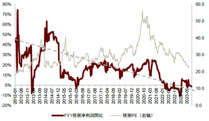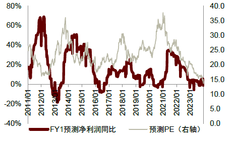 图表2:A股大众品公司FY1预测净利润增速与预测PE