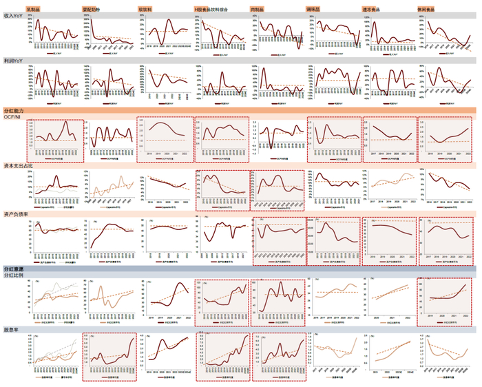 大众品板块公司分红能力及分红比例梳理。1)从分红能力上来看,我们认为部分大众品板块已具备一定的分红能力,主要关注两大指标,①盈利能力(自由现金流,OCF/NI等);②其他支出相关指标(Capex/rev,资产负债率等)。几乎所有的大众品子板块在OCF/NI指标上表现较好(长期高于1),表明大众品板块的盈利质量较高。在资本支出占比指标上,肉制品和港股食品综合表现相对较好(长期低于5%)。在资产负债率上,肉制品、调味品、速冻食品和休闲食品表现较好(长期远低于50%)。2)从分红意愿上来看,肉制品、港股食品综合分红比例较高(长期高于50%),其他子板块的分红比例有一定提升趋势,但比例仍相对较低。