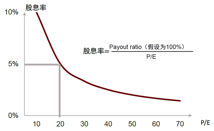 理想假设下,当100%分红时5%的股息率对应20x PE估值区间。考虑股息率=payout ratio/PE,假设某家公司payout ratio保持100%,则股息率=1/PE,股票收益率与估值成反比,若股票收益率过高,则会吸引资金投入,并带动估值上行,最后稳定在一定的平,来满足市场预期的股票回报率。考虑目前美国十年期国债收益率4%/中国十年期国债收益率2.5%,我们认为对于H/A股理想假设下(股票存在风险,不同投资者风险偏好亦不同,简化风险调整假设)当股票率与回购比例之和高于4/2.5%,则估值基本处于底部区间。相比国债收益率,股票5%收益率已具备较高吸引力,则20x PE估值则为该股票的底部区间附近。