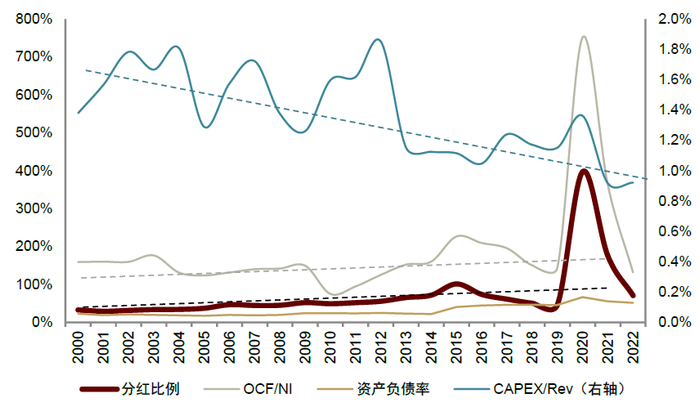 ► 从负债率上看,分红比例提升初期,资产负债率中枢为30%上下。朝日啤酒在2000-2022年资产负债率均值约28%,公司负债率长期围绕30%水平上下波动。