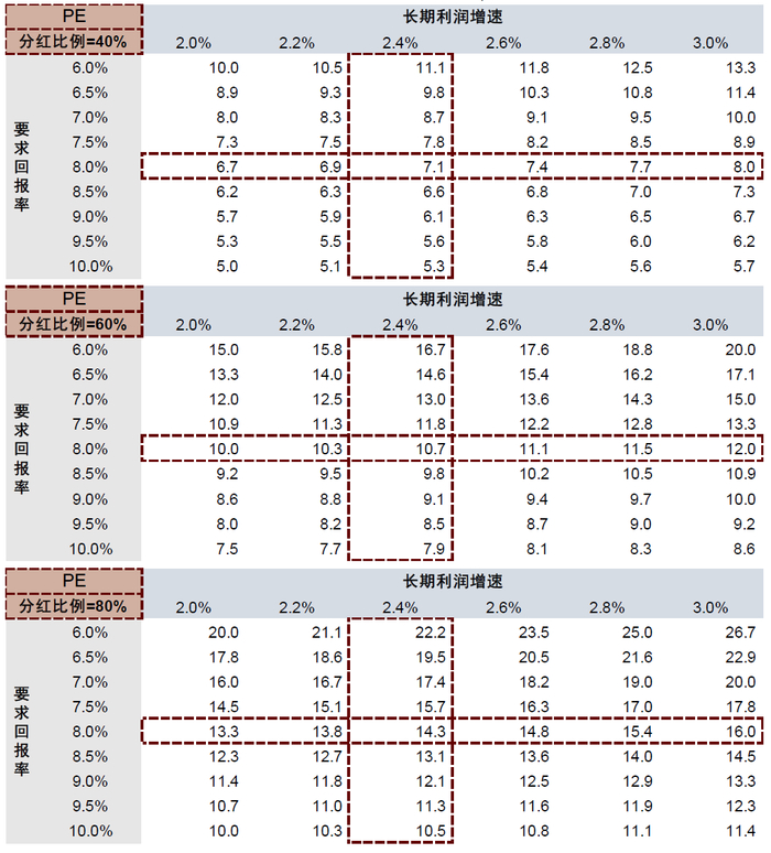 图表8:不同分红比例、利润增速和要求回报率的假设下,计算合理估值水平