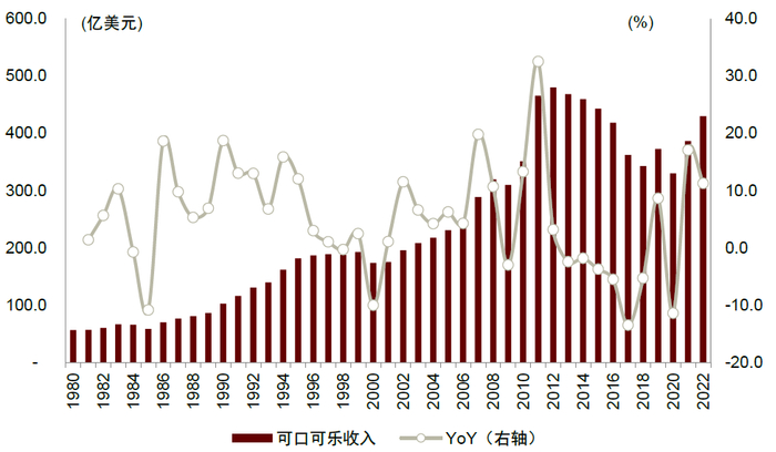 可口可乐自1980年至今的业绩表现可分为三个阶段。1)1980-1999年收入CAGR为6.7%,期间公司拓展新兴市场业务,驱动销量较快增长。2)2000-2012年收入CAGR为8.9%,期间公司收购装瓶商业务、进行品类拓张和产品结构升级,维持增速较快增长。3)2013-2022年收入CAGR为-1.1%,期间公司剥离装瓶业务,该阶段公司的业务模式也较为成熟,整体增速放缓。