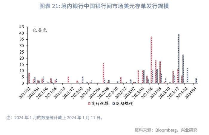 美元存单:共有39亿美元存单到期。中国进出口银行、汇丰银行(中国)共发行3只美元存单,发行规模为11.1亿美元。截至2024年1月11日,总未偿额为51.1亿美元。值得注意的是,今年1月的美元存单到期量仍有22.8亿之多,境内银行间的美元流动性冲击恐未完全消退。
