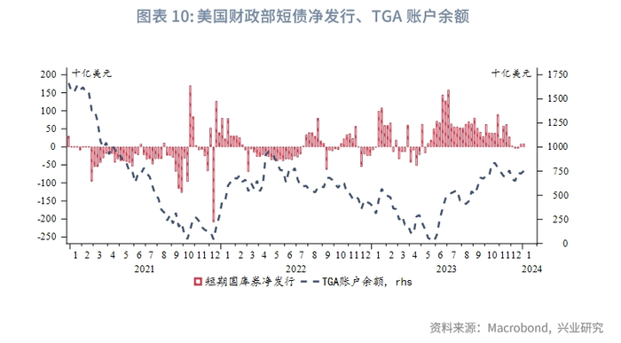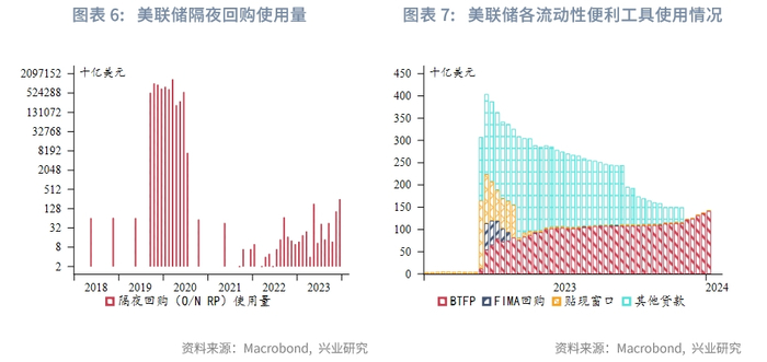 流动性工具使用方面,美联储紧缩缓冲垫——隔夜逆回购规模回落至6800亿美元,好在近期短期美债发行量有所下降,逆回购下行速度趋缓。隔夜回购便利使用量增加,且BTFP使用量连续增长。第一季度预计将有大规模BTFP到期,需警惕相关流动性冲击。