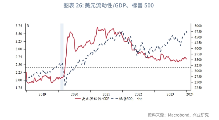 SOFR、FFR、OBFR价差于2023年年末出现不同程度的走阔,其中回购市场资金紧张状况最为显著,好在当前均已恢复常规水平。此次跳升和年末效应有关,一级交易商关账限制了资金可用性。Libor和OIS利差在2023年12月继续扩大,但自2024年以来有所收敛。非美主流央行和美联储货币互换协议的使用情况方面,年末欧央行大规模使用了14天美元货币互换,日央行的使用量较去年11月略有增加。近期美元真实流动性边际紧张打压美股表现。