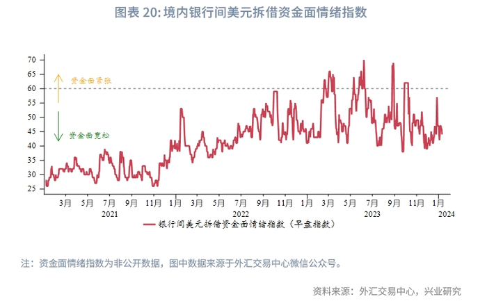 境内美元市场方面,2023年12月大规模境内美元存单到期给市场带来压力,美元拆借、回购市场交易量下降,拆借情绪指数走高。2024年1月境内美元存单到期量依然较大,需警惕冲击余波。
