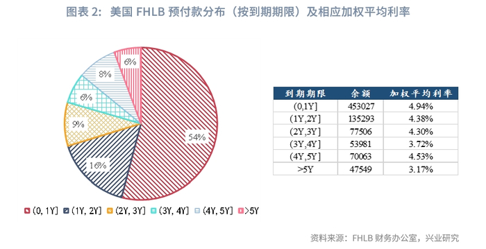 在资产端,FHLB通常将资金运用于预付款(Advances)和投资两项。此处的预付款即预支贷款,指FHLB以有抵押的形式将资金融出给金融机构。抵押品可以是合格的证券、住房抵押贷款,某些情形下也可以涵盖商业地产。预付款主要包括固息、浮息、隔夜、分期、可转换、期权杂交(Hybrid)六种类型。其中,可转换预付款指的是可以在固息和浮息之间切换的协议;期权杂交预付款指包含嵌入式期权的协议,这些期权可以赋予借款人在一定条件下获得额外的可以与利率、还款方式、提前还款等方面相关的权利或利益。固息预付款的期限一般从一天到30年不等。浮息预付款的期限通常从30天到20年不等,利率与SOFR等指标挂钩。从到期期限的分布来看,FHLB预付款大多将于未来两年内到期。当借款方违约时,FHLB可享受“超级留置权(super lien)”,即具有非常高的偿还优先级。其优先级甚至高于联邦存款保险公司(FDIC)。预付款是FHLB支持金融机构的主要手段。以2023年初欧美银行业危机发酵期间为例,截至2023年第一季度末,FHLB预付款规模扩张至1.04万亿美元,高出2022年末0.23万亿美元,相比2022年同期增长超过一倍。其中,硅谷银行、签名银行和第一共和银行在倒闭前均从FHLB获得了数以十亿美元计的贷款[1]。