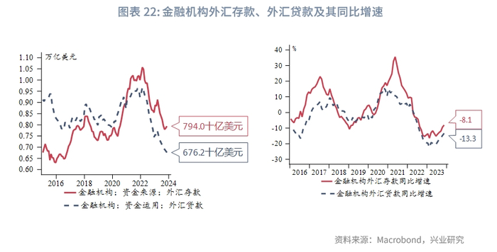 美元存贷款:截至2023年11月,金融机构外汇存款总额7940亿美元,外汇贷款总额6762亿美元。金融机构外汇存款同比增速-8.1%,贷款同比增速-13.3%,保持上升趋势。