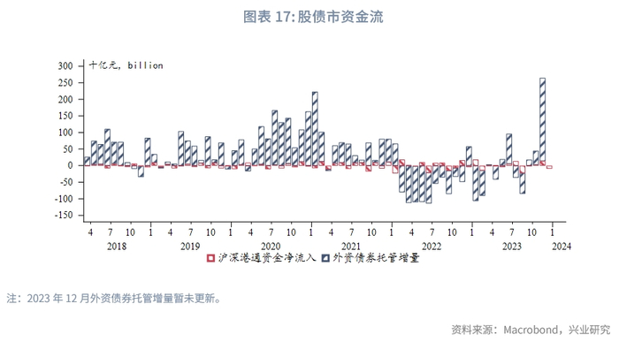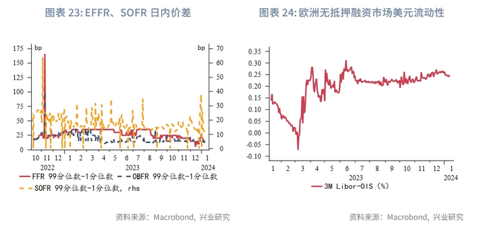 美联储去年12月议息会议首次讨论降息,但纪要显示官员们仍高度重视通胀反弹风险。从官员言论来看,2024年降息2-3次,降息时点落在下半年。第一季度预计将有大规模BTFP到期,需警惕相关流动性冲击。12月大规模境内美元存单到期给市场带来压力,今年1月到期量依然较大,关注余波。年末美国拆借、回购市场资金再现紧张状况,这和一级交易商关账限制资金可用性的季节性因素有关。