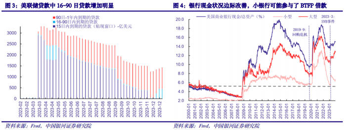 首先,关于BTFP用量上行是否与银行流动性压力上行有关,答案可能是否定的;在银行现金水平没有加速恶化的情况下,BTFP的上行应该被理解为利用借款机制中的问题进行无风险套利的行为。进行无风险套利的“玄机”来自于1年OIS利率在降息预期下的波动降低。通常,1年OIS利率可以被理解为该市场交易者对美联储未来1年利率的预期,这就导致在市场预期加息时OIS利率上升,但在降息预期主导的当前,OIS利率是趋于下降的,于时就产生了套利空间。具体来看,自美联储11月FOMC会议以来,2024年的降息预期逐步深化,这也导致了OIS利率的明显下行。从2023年12月 初至2024年1月9日,1年OIS利率均值为4.90%(加点后5.0%),1月9日为4.84%(加点后4.94%),与5.40%的IORB相比存在明显的套利空间。银行只需要将BTFP借款存入美联储的银行准备金账户即可无风险获得利差,这种行为在BTFP停止前可能仍会持续,但并不表明银行的流动性再度紧张,尽管小银行的流动性情况远不如大银行健康。