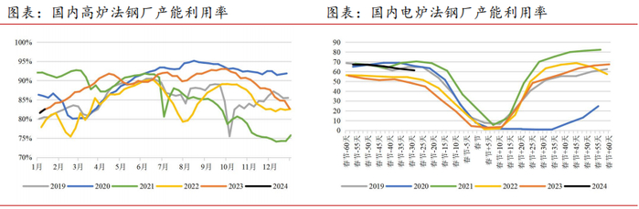 供应方面,虽然高炉钢厂亏损延续,钢价静态成本估值向下空间较小,但是铁矿、双焦库存亦进入累库阶段。铁矿方面,虽红海危机持续升温导致进口矿海运费成本上升,但由于在市场预期美联储降息进程延后,引发商品价格整体回落,铁矿亦价格明显回落。煤焦方面,一季度国内煤炭保供发力,同时煤焦进口可能延续增长,煤焦供给逐渐宽松,价格逐渐承压。钢厂方面,短期内电炉利润较好,电炉开工回升为螺纹钢、线材带来供给边际增量,对热卷影响则相对较小。今年一季度,钢材生产成本或有继续走弱风险,钢材供应亦趋于宽松。