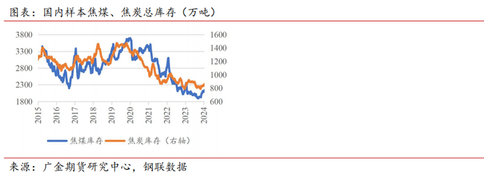 从库存来看,焦钢企业原料、成品库存整体较前期低位回升,但仍然处于往年同期偏低水平,国内焦钢企业焦煤总库存1772.2万吨,环比-0.28%,同比-10.85%;企业焦炭总库存708.66万吨,环比+2.93%,同比-1.90%。
