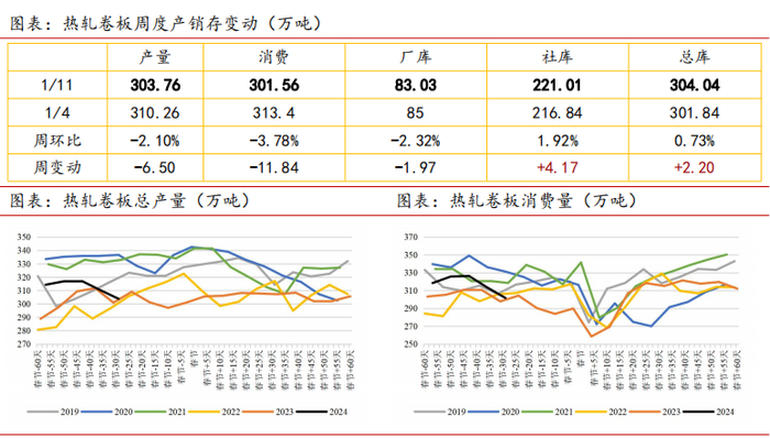 行情回顾:本周成品钢材价格有所回落,期货主力2405合约截至周五下午收盘,螺纹价3902元/吨(-77/-1.94%)、热卷价4026元/吨(-53/-1.30%),整体来看,五大品种钢材供需季节性双降,社会库存继续增加,库存天数相比往年春节前同期相对较高,一季度煤焦供应渐宽松,成品钢材生产成本支撑或有坍塌风险。此外,板材消费继续强于建材,支撑钢材整体消费增长: