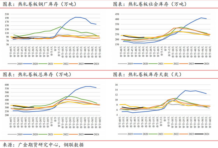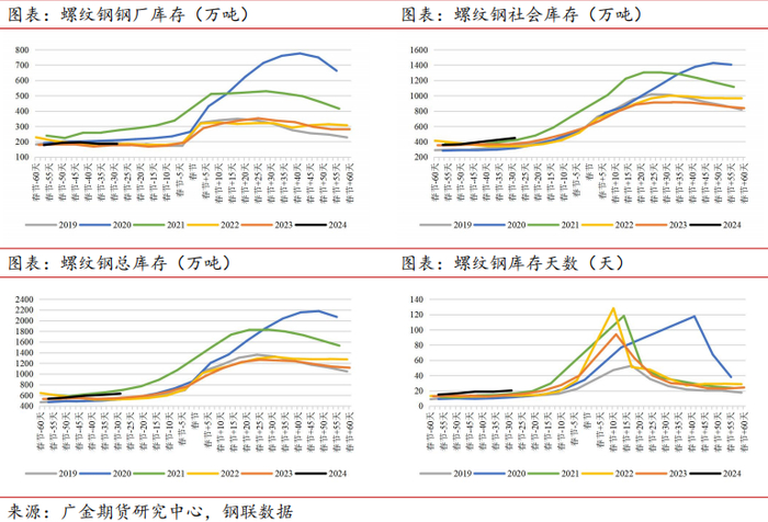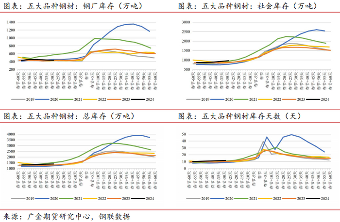 截至本周五,距离春节第29天,本周五大品种钢材供需季节性双降,社会库存继续增加,库存天数相比往年春节前同期相对较高: