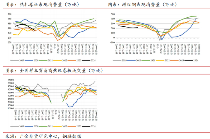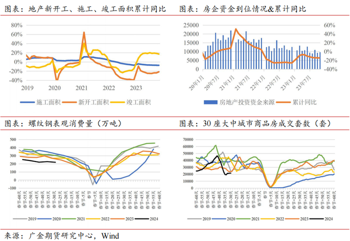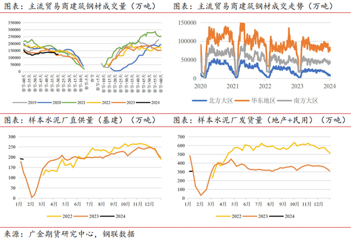 供应方面,虽然高炉钢厂亏损延续,钢价静态成本估值向下空间较小,但是铁矿、双焦库存亦进入累库阶段。铁矿方面,虽红海危机持续升温导致进口矿海运费成本上升,但由于在市场预期美联储降息进程延后,引发商品价格整体回落,铁矿价格亦明显回落。煤焦方面,一季度国内煤炭保供发力,同时煤焦进口可能延续增长,煤焦供给逐渐宽松,价格逐渐承压。钢厂方面,短期内电炉利润较好,电炉开工回升为螺纹钢、线材带来供给边际增量,对热卷影响则相对较小。今年一季度,钢材生产成本或有继续走弱风险,钢材供应亦趋于宽松。