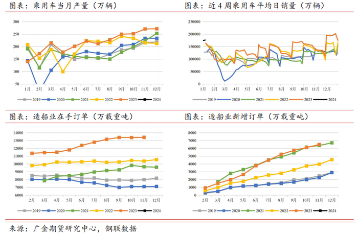 需求方面,春节临近导致消费季节性走弱,热卷表现好于螺纹。企业、居民购房的能力及意愿降低,存量房积压,新开工面积增速大幅走低拖累建材消费,在建筑行业走弱的拖累下,加上建筑工地逐渐放假,螺纹钢需求弱于往年春节前同期水平。而汽车、造船业订单增长在一定程度上拉动了板材的消费,对于热轧卷板等板材消费形成支撑,热卷相对螺纹而言需求表现更好。