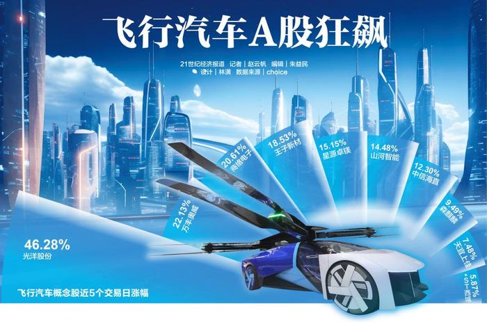 概念股中,光洋股份(002708.SH)录得涨停,近5个交易日涨幅超46%,被市场人士称为“飞行汽车妖股”。紧随其后的则是万丰奥威(002085.SZ)和商络电子(300975.SZ),近五个交易日分别涨22.12%和20.60%。