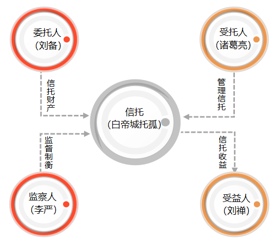 其实,“白帝城托孤”已是一个非常完备的信托行为。刘备作为委托人,将蜀国江山作为“信托资产”,交给受托人诸葛亮进行管理,信托目的十分明确:保护受益人刘禅的利益。甚至还有李严作为信托监察人,起到监督和制衡受托人的作用。