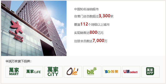 华润万家是华润集团旗下优秀零售连锁企业,业务覆盖中国内地及香港市场。2022年底,华润万家门店遍布全国29个省、自治区、直辖市和特别行政区,门店分布全国109个地级以上城市,门店总数3130家,实现营业收入692.35亿元,会员人数逾9300万人,员工人数8.51万人。旗下拥有华润万家、苏果、Ole’、萬家MART、萬家CITY、萬家LIFE等多个著名品牌。
