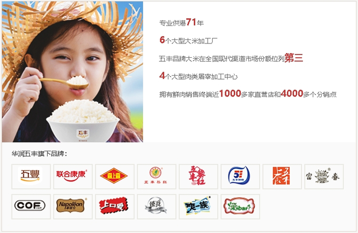华润五丰有限公司是一家集食品研发、生产、加工、运输和批发零售于一体的综合食品企业集团,主营业务包括蔬果、肉食、冷冻食品、大米及现代农业产业。