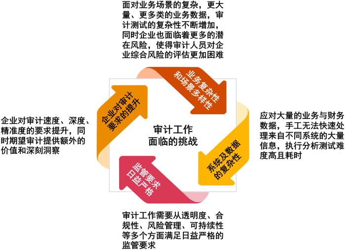 由于企业业务、场景、系统的复杂化,各方对审计的要求不断提高,审计工作面临以下挑战: