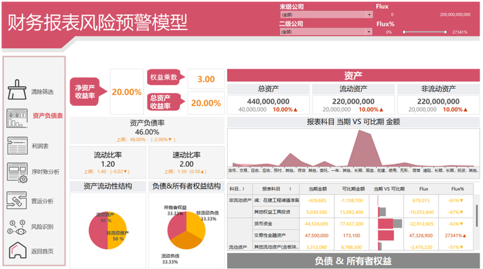 在审计计划阶段,利用财务基础数据探查的方式,快速了解企业整体财务状况,识别潜在重点关注的高风险领域。通过展示财务科目历年情况、财务指标与科目具体构成等信息,及可调节的波动阈值或波动百分比、序时账快速筛选等功能,协助审计人员简化异常科目的筛选、识别关键业务板块、简易明细数据查看,为审计人员初步了解财务数据提供支持。