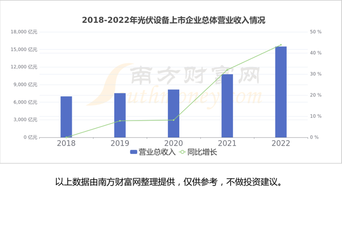 根据南方财富网趋势选股系统数据统计,A股光伏设备相关上市企业目前数量有127家,2022年总体营业收入约为15509.85亿元,同比增加43.89%。光伏设备上市公司2018至2023年总体营业收入情况如下: