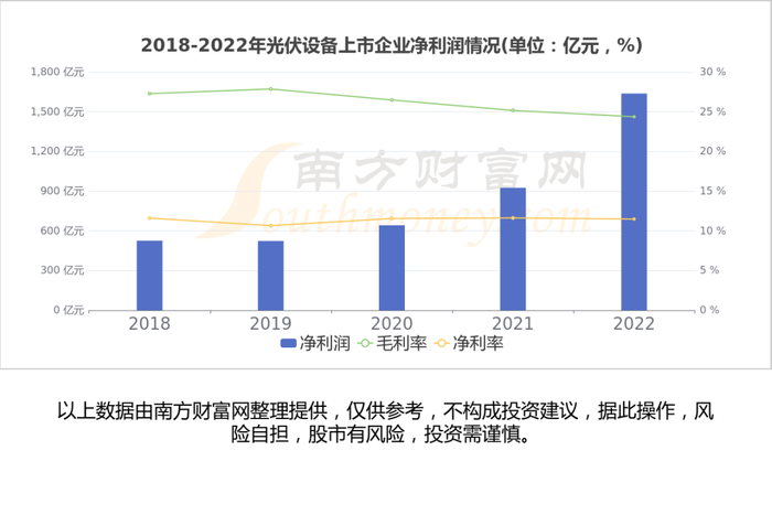 南方财富网趋势选股系统数据显示,2022年A股127家光伏设备相关上市公司总体归母净利润为1638.03亿元,同比增加76.95%,高于2021年水平。从光伏设备行业利润率来看,2022年平均毛利率24.38%,较2021年有所下滑,平均净利率11.49%,较2021年有所下滑。