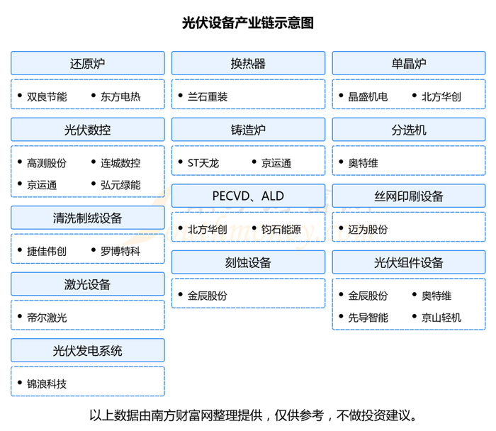 光伏设备产业链包含还原炉、换热器、单晶炉、光伏数控、铸造炉等环节。还原炉公司主要包括双良节能、东方电热;换热器公司主要包括兰石重装;单晶炉公司主要包括晶盛机电、北方华创;光伏数控公司主要包括高测股份、连城数控、京运通、弘元绿能;铸造炉公司主要包括ST天龙、京运通。