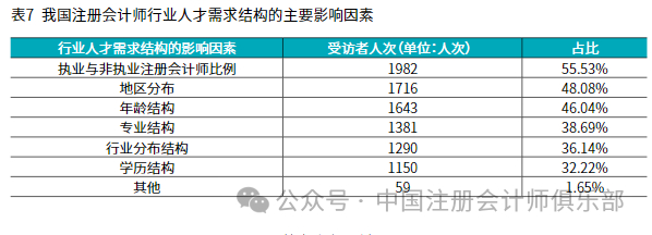 3.行业人才需求结构的主要影响因素。我国注册会计师行业人才需求结构的主要影响因素结果详见表7。超过一半的受访者(55.53%)认为影响的注册会计师行业人才需求结构的最主要因素是执业与非执业注册会计师比例,48.08%/46.04%受访者分别认为地区分布、年龄结构是影响注册会计师行业人才需求结构的另两大主要因素。
