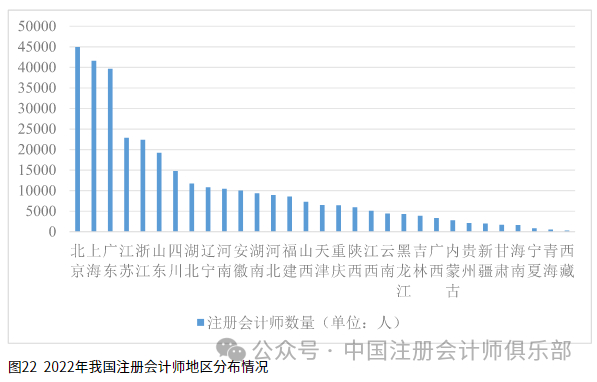 地区分布结构方面,以2022年我国注册会计师人才的地区分布为例,2022年我国注册会计师人才主要集中在发达地区。其中,北京市的注册会计师人数最多,共计44925人,占比13.41%;其次为上海市,共计41565人,占比12.41%;再次为广东省,共计39685人,占比11.85%。与之形成鲜明对比的是,一些欠发达地区的注册会计师人数则相对不足,西藏、青海、宁夏、海南等注册会计师数量最少的10个省份的注册会计师人数合计为19374人,还不到北京市的一半;西藏注册会计师人数仅为326人,占比0.1%,与发达地区相差甚远,具体如图22所示。