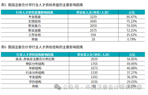 4.小结。从注册会计师供给的角度来看,受访者认为目前影响我国注册会计师人才数量的主要因素分别是行业薪酬水平、社会地位与责任不匹配以及行业风险程度,影响我国注册会计师人才质量的主要因素分别是专业技能、实践经验、职业能力以及职业道德,影响我国注册会计师人才结构的主要因素分别执业注册会计师中执业与非执业注册会计师的比例、地区分布结构以及年龄结构。