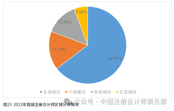 从四大经济区的分布来看,2022年,我国注册会计师人才主要分布在东部,占比64.59%,中部占比16.14%,西部占比13.58%,东北占比5.68%,比重最低,具体详见图23所示。