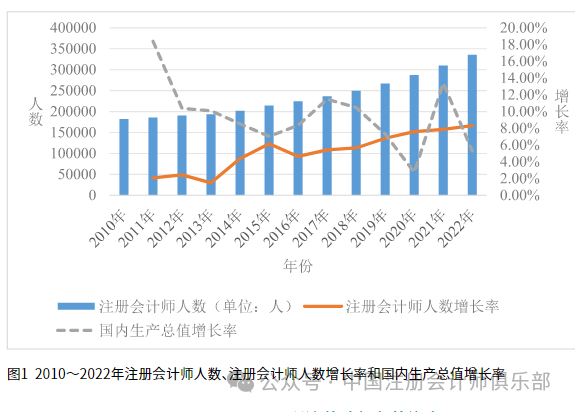 进一步对比国内生产总值和增长率数据可以发现,2010~2022年国内生产总值呈现持续增长趋势,增长率分布在2.74%~18.40%之间。受疫情影响,除个别年份(2020年和2022年)外,我国注册会计师人数增长率均低于国内生产总值增长率,在某种程度上说明我国注册会计师供给尚未与经济需求实现同比例增长。